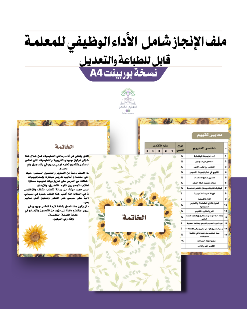 ليس مجرد ملف إنجاز، بل هو هوية تعليمية متكاملة تُجسّد تميزك في الأداء الوظيفي، وتُبرز دورك الريادي في مجال النشاط الطلابي. مستلهم من رمزية تبّاع الشمس في النمو، التوجه نحو الضوء، والارتقاء المستمر.