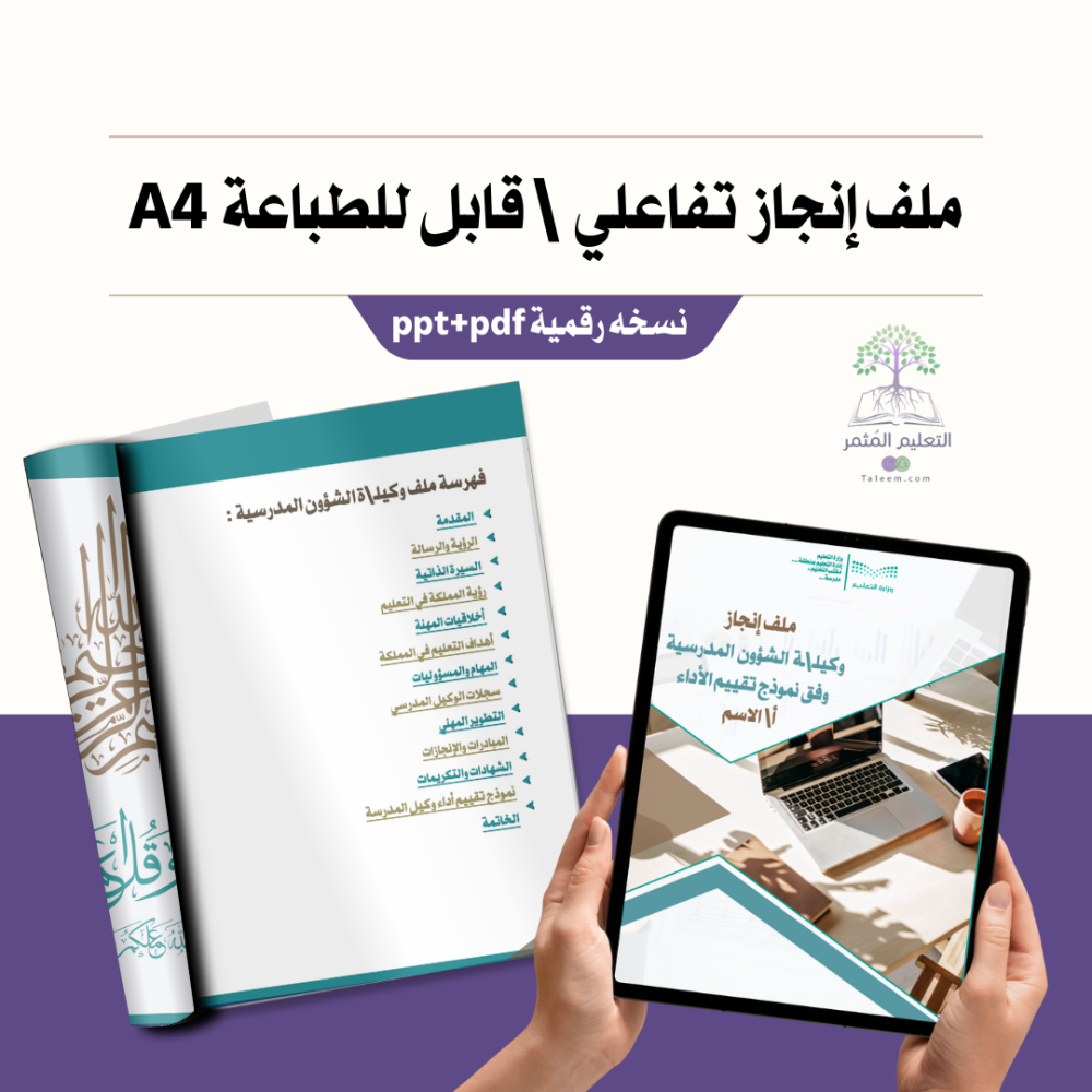 ملف إنجاز وكيل/وكيلة الشؤون المدرسية هو ملف تفاعلي متكامل مصمم وفق نموذج تقييم الأداء الجديد المعتمد من وزارة التعليم السعودية. يهدف إلى توثيق الأداء الإداري والتربوي للوكيل/الوكيلة المدرسية، مع توفير أدوات تفاعلية سهلة الاستخدام تسهل عملية التنظيم والمتابعة.