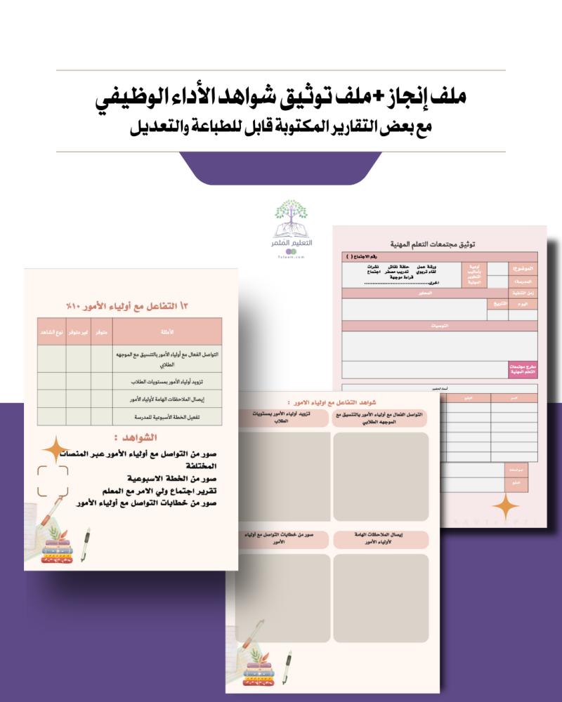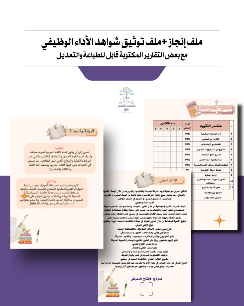 يعد ملف الإنجاز لمعلمة اللغة العربية وملف توثيق الأداء الوظيفي وثيقة مهنية شاملة تجمع بين توثيق الأداء التعليمي والتطوير المهني وفق أحدث المعايير، مما يتيح للمعلمة متابعة إنجازاتها، تقييم أدائها، وتحسين ممارساتها التدريسية بشكل احترافي.