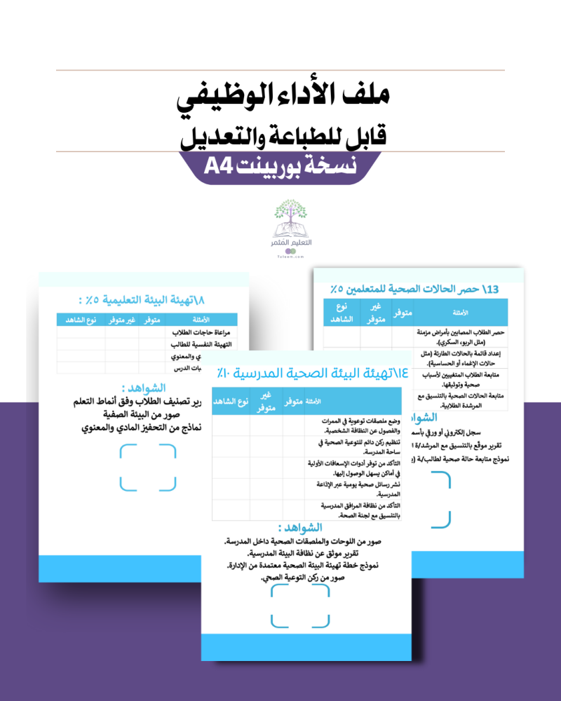 تم تصميمه خصيصًا لتوثيق المهام التعليمية والصحية لمعلم/ـة التوجيه الصحي، ويعكس الجهود المبذولة في تعزيز الصحة المدرسية وفق معايير وزارة التعليم، ويحتوي على جميع البنود المعتمدة للأداء الوظيفي بالإضافة إلى بنود التوجيه الصحي المعتمدة.